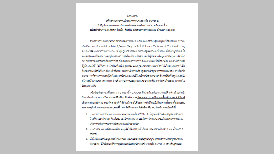 เครือข่ายประชาชนเพื่อลดการระบาดของเชื้อ COVID-19 มีความกังวลต่อสถานการณ์ดังกล่าวเป็นอย่างยิ่ง จึงขอเรียกร้องมาตรการปิดประเทศ ปิดเมือง ปิดบ้าน และประกาศภาวะฉุกเฉินระยะสั้น เป็นเวลา 3 สัปดาห์ เพื่อหยุดการแพร่กระจายของโรค และทำให้บ้านเมืองกลับคืนสู่สภาพปกติโดยเร็วที่สุด รวมทั้งหยุดยั้งผลกระทบทางเศรษฐกิจที่จะทอดเวลาออกไปนานขึ้น หากไม่มีมาตรการที่เข้มข้น เพียงพอ โดยมีรายละเอียดดังนี้