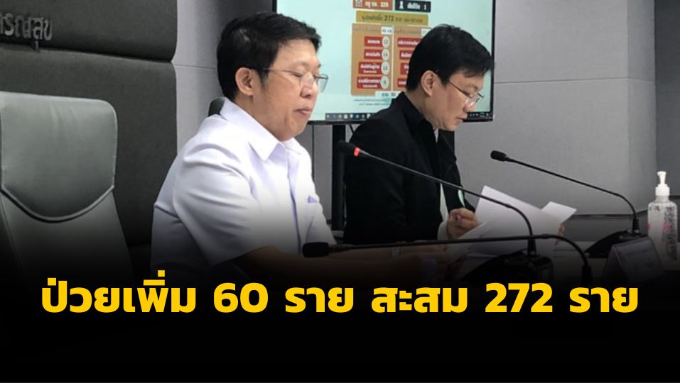 สธ.19 มี.ค.-อธิบดีกรมควบคุมโรค เผยคนป่วยโควิด-19 พบเพิ่ม 60 คน ทำให้ยอดป่วยพุ่ง 272 คน ส่วนใหญ่เป็นกลุ่มป่วยเดิมที่มาจากสนามมวย ทั้งลุมพินี ราชดำเนิน จิตเมืองนนท์ และยังมีกลุ่มคนจากผับ การติดเชื้อ พบในทุกกลุ่มอาชีพ ย้ำคนอยู่ในกลุ่มเฝ้าระวัง14 วัน ยังฝ่าฝืนออกนอกบ้าน ไปสาธารณะ โดนดำเนินคดีแน่ ขอความร่วมมือช่วยกัน เลี่ยงแออัด