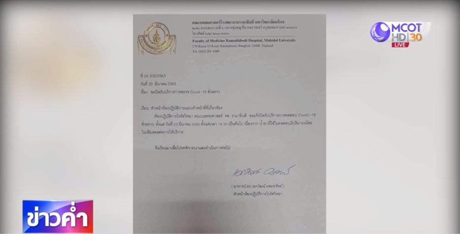 คณะแพทยศาสตร์ รพ.รามาธิบดี ม.มหิดล ออกประกาศเรื่องขอปิดรับบริการตรวจโควิด-19 ชั่วคราว เนื้อความระบุว่า เรียนหัวหน้าห้องปฏิบัติการและเจ้าหน้าที่ที่เกี่ยวข้อง ห้องปฏิบัติการไวรัสวิทยา คณะแพทยศาสตร์ รพ.รามาธิบดี ขอแจ้งปิดรับบริการการทดสอบโควิด-19 ชั่วคราว ตั้งแต่วันที่ 20 มี.ค.2563 เวลา 16.30 น. เนื่องจากน้ำยาที่ใช้ทดสอบมีปริมาณน้อย ไม่เพียงพอต่อการให้บริการ.-สำนักข่าวไทย