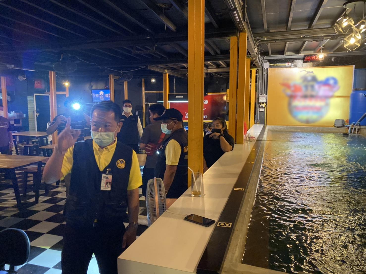 การตรวจสอบพบว่าส่วนใหญ่ให้ความร่วมมือด้วยดีปิดบริการตามประกาศ และมีเพียง 1 แห่งที่ยังเปิดดำเนินการอยู่ในพื้นที่ย่านพัทยาใต้ โดยสถานที่ดังกล่าวชั้นล่างเปิดเป็นบ่อตกกุ้ง ชั้นบนเปิดเป็นผับลักษณะเอาท์ดอร์ ยังคงเปิดบริการจำหน่ายเครื่องดื่มสุราให้กับนักท่องเที่ยวจำนวนมาก เจ้าหน้าที่จึงแจ้งข้อกล่าวหาผู้จัดการ “เปิดสถานบริการโดยไม่ได้รับอนุญาต และจำหน่ายสุราโดยไม่ได้รับอนุญาต เนื่องจากฝ่าฝืนคำสั่งคณะกรรมการควบคุมโรคติดต่อจังหวัดชลบุรี