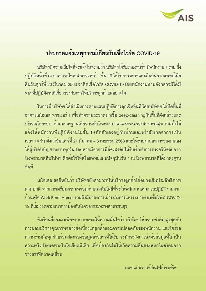 ด้าน บมจ.แอดวานซ์ อินโฟร์ เซอร์วิส แจ้งว่า บริษัทฯมีความเสียใจที่จะแจ้งให้ทราบว่า บริษัทฯได้รับรายงานว่า มีพนักงาน 1 ราย ซึ่ง ปฏิบัติหน้าที่ ณ อาคารเอไอเอส ทาวเวอร์ 1 ชั้น 19 ได้รับการตรวจและยืนยันจากแพทย์เมื่อ คืนวันศุกร์ที่ 20 มีนาคม 2563 ว่าติดเชื้อไวรัส COVID-19 โดยพนักงานท่านดังกล่าวมิได้มี หน้าที่ปฏิบัติงานที่เกี่ยวข้องกับการให้บริการลูกค้าแต่อย่างใด ในการนี้ บริษัทฯ ได้ดำเนินการตามแผนปฎิบัติการฉุกเฉินทันที โดยบริษัทฯ ได้ปิดพื้นที่อาคารเอไอเอส ทาวเวอร์ 1 เพื่อทำความสะอาดฆ่าเชื้อ deep-cleaning ในพื้นที่ดังกล่าวและบริเวณโดยรอบ ด้วยมาตรฐานเดียวกันกับโรงพยาบาลและกระทรวงสาธารณสุข รวมทั้งได้แจ้งให้พนักงานที่ปฏิบัติงานในชั้น 19 กักตัวเองอยู่กับบ้านและเฝ้าสังเกตอาการเป็นเวลา 14 วัน ตั้งแต่วันเสาร์ที่ 21 มีนาคม – 3 เมษายน 2563 และให้รายงานอาการของตนเอง ให้ผู้บังคับบัญชาทราบทุกวัน โดยหากมีอาการที่ต้องสงสัยให้รีบเข้ารับการตรวจวินิจฉัยจากโรงพยาบาลที่บริษัทฯ ติดต่อไว้ให้หรือแพทย์แผนปัจจุบันชั้น 1 ณ โรงพยาบาลที่ได้มาตรฐานทันที