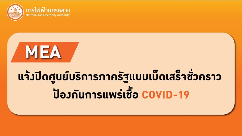 กรุงเทพฯ 22 มี.ค. – MEA แจ้งปิดศูนย์บริการภาครัฐแบบเบ็ดเสร็จชั่วคราว ป้องกันการแพร่เชื้อ COVID-19