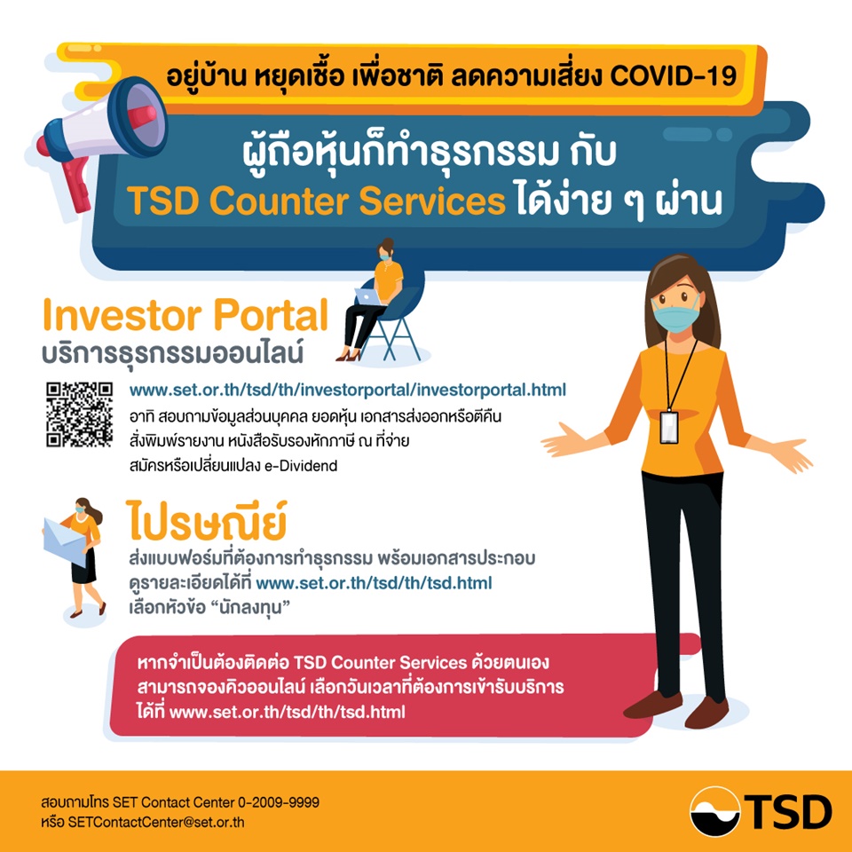 กรุงเทพฯ 22 มี.ค. – TSD Counter Services ชวนผู้ลงทุนใช้ช่องทางติดต่อผ่านออนไลน์และไปรษณีย์ เพื่อลดความเสี่ยงจาก COVID-19
