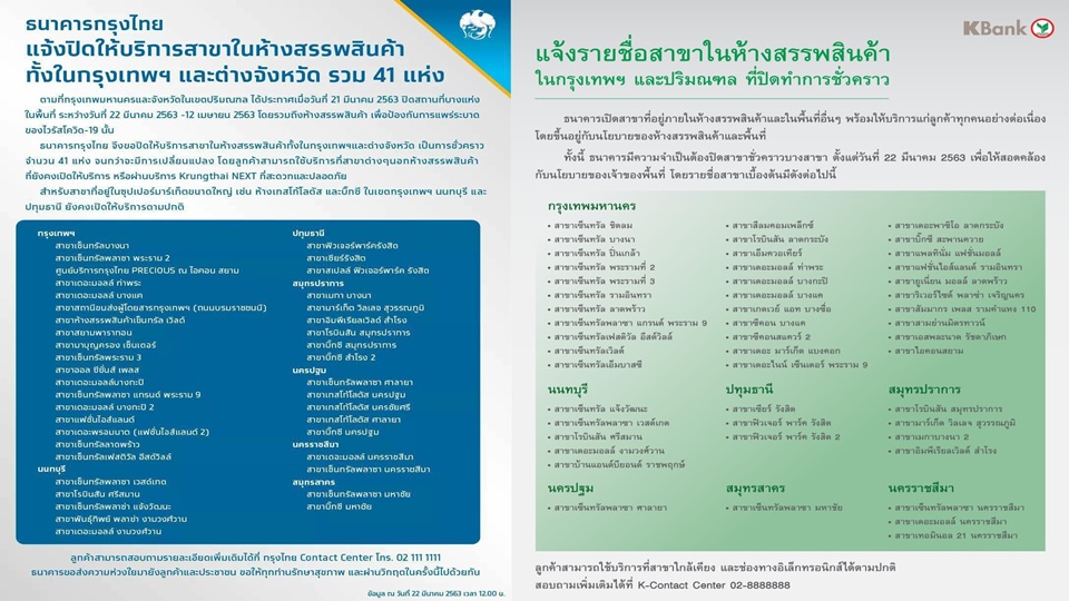 ธนาคารกรุงไทย จำกัด (มหาชน) จึงขอปิดให้บริการสาขาในห้างสรรพสินค้าทั้งในกรุงเทพฯ ปริมณฑล และจังหวัดนครราชสีมาเป็นการชั่วคราว 41 แห่ง จนกว่าจะมีการเปลี่ยนแปลง โดยลูกค้าสามารถใช้บริการที่สาขาต่าง ๆ นอกห้างสรรพสินค้าที่ยังคงเปิดให้บริการ หรือผ่านบริการ Krungthai NEXT ที่สะดวกและปลอดภัย สำหรับสาขาที่อยู่ในซูเปอร์มาร์เก็ตขนาดใหญ่ เช่น ห้างเทสโก้โลตัส และบิ๊กซี ในกรุงเทพฯ นนทบุรี และปทุมธานี ยังคงเปิดให้บริการตามปกติ ลูกค้าสามารถค้นหาที่ตั้งของสาขาได้ทางเว็บไซต์ https://krungthai.com/th/contact-us/ktb-location หรือสอบถามที่ กรุงไทย Contact Center โทร. 02 111 1111