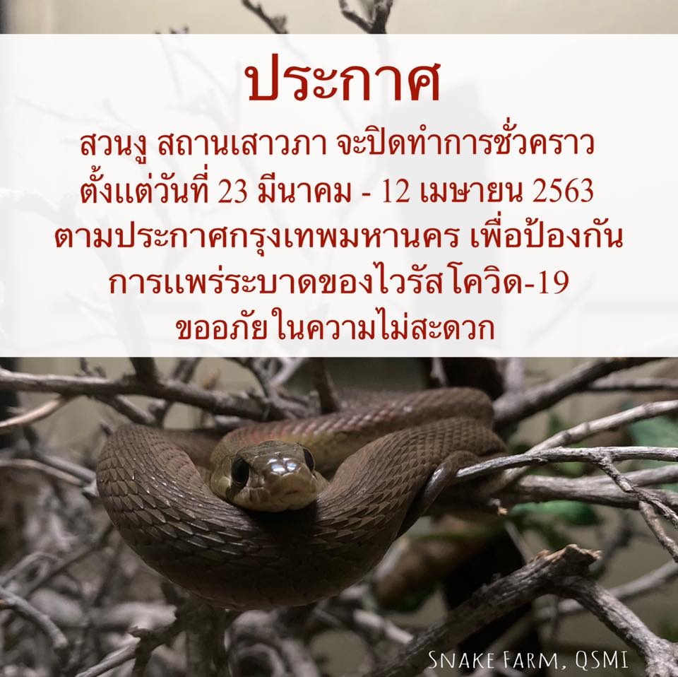 Snake Farm, QSMI will be temporarily closed from 23 March 2020 to 12 April 2020.-สำนักข่าวไทย