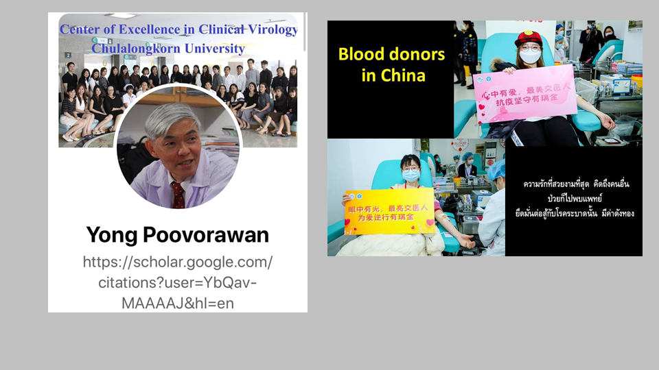 ศ.นพ.ยง ภู่วรวรรณ หัวหน้าศูนย์เชี่ยวชาญเฉพาะทางด้านไวรัสวิทยาคลินิก ภาควิชากุมารเวชศาสตร์ คณะแพทยศาสตร์ จุฬาลงกรณ์มหาวิทยาลัย โพสต์ข้อความในเฟซบุ๊กส่วนตัว ถึงสถานการณ์โรคโควิด-19 กับการขาดแคลนโลหิต โดยมีข้อความระบุว่า