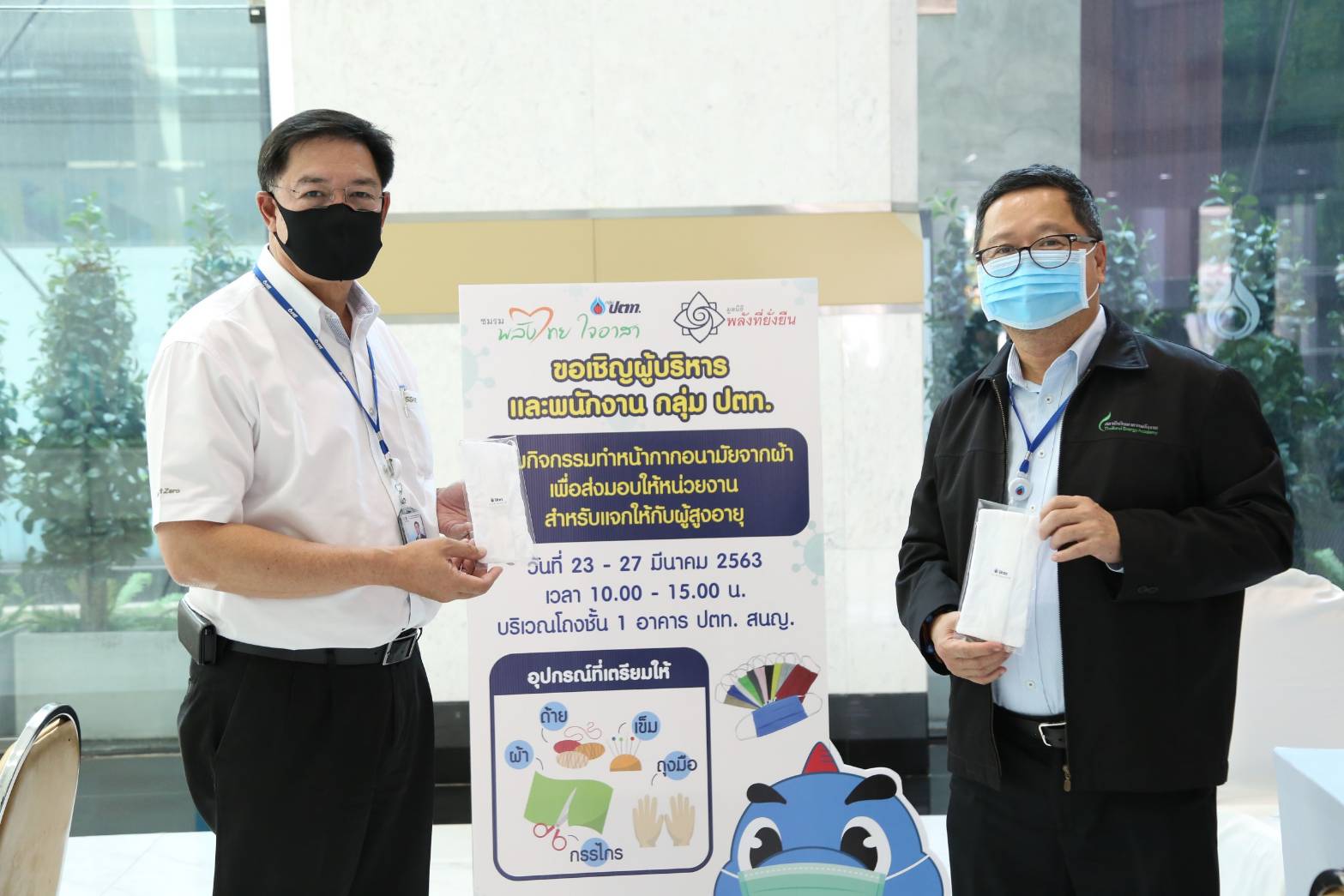 นายชาญศิลป์ ตรีนุชกร ประธานเจ้าหน้าที่บริหารและกรรมการผู้จัดการใหญ่ บริษัท ปตท. จำกัด (มหาชน) (ปตท.) เปิดเผยว่า ปตท. โดย “ชมรมพลังไทย ใจอาสา กลุ่ม ปตท.” และ “มูลนิธิพลังที่ยั่งยืน” ได้เชิญชวนผู้บริหาร พนักงานกลุ่ม ปตท. และชุมชนเครือข่าย ร่วมทำหน้ากากอนามัยจากผ้า จำนวน 3,000 ชิ้น ระหว่างวันที่ 23 – 27 มีนาคม 2563 เพื่อส่งมอบให้กรมกิจการผู้สูงอายุ สังกัดกระทรวงการพัฒนาสังคม และความมั่นคงของมนุษย์ นำไปกระจายแก่ศูนย์พัฒนาการจัดสวัสดิการสังคมผู้สูงอายุทั้ง 12 แห่งทั่วประเทศ อันเป็นการช่วยป้องกันการแพร่ระบาดของเชื้อไวรัสโควิด-19 ที่ผู้สูงอายุ ซึ่งถือเป็นกลุ่มเสี่ยงต่อการติดเชื้อ