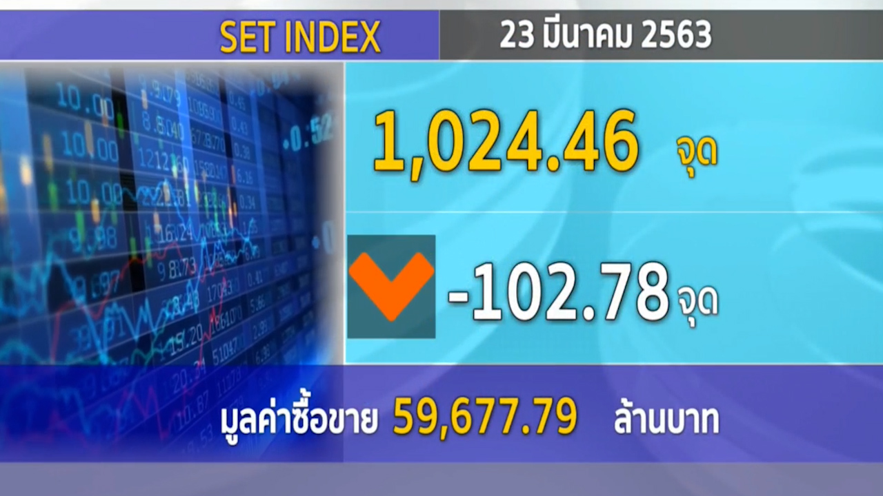 กรุงเทพฯ 23 มี.ค.-ตลาดหลักทรัพย์ปิดวันนี้ที่ระดับ 1,024.46 จุด ลดลง 102.78 จุด (-9.12%) มูลค่าการซื้อขาย 59,677.79 ล้านบาท