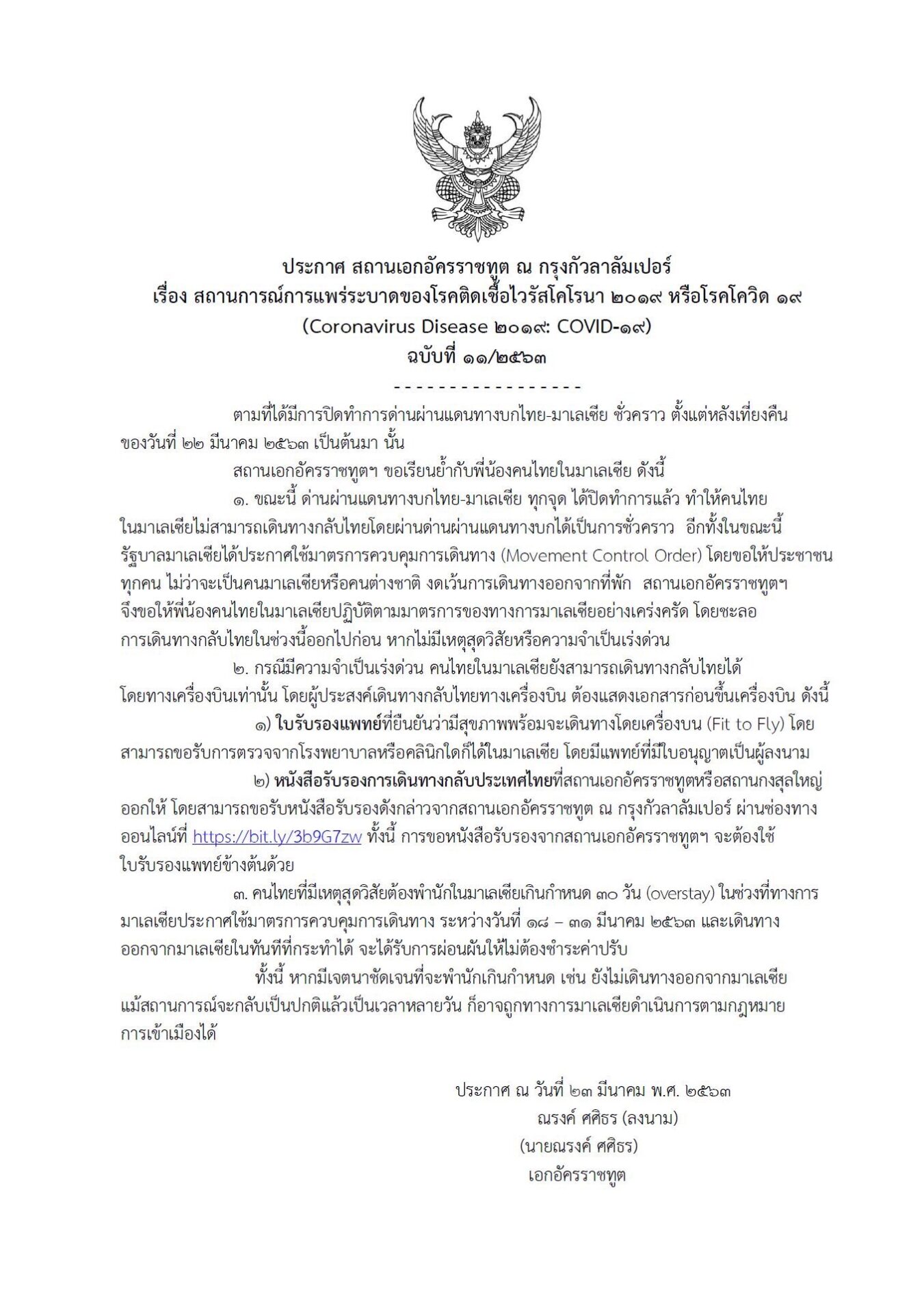 สถานทูตฯขอให้ประชาชนไทยในมาเลเซียปฏิบัติตามมาตรการของทางการมาเลเซียอย่างเคร่งครัด และชะลอการเดินทางกลับไทยในช่วงนี้ออกไปก่อน หากไม่มีเหตุสุดวิสัยหรือความจำเป็นเร่งด่วน