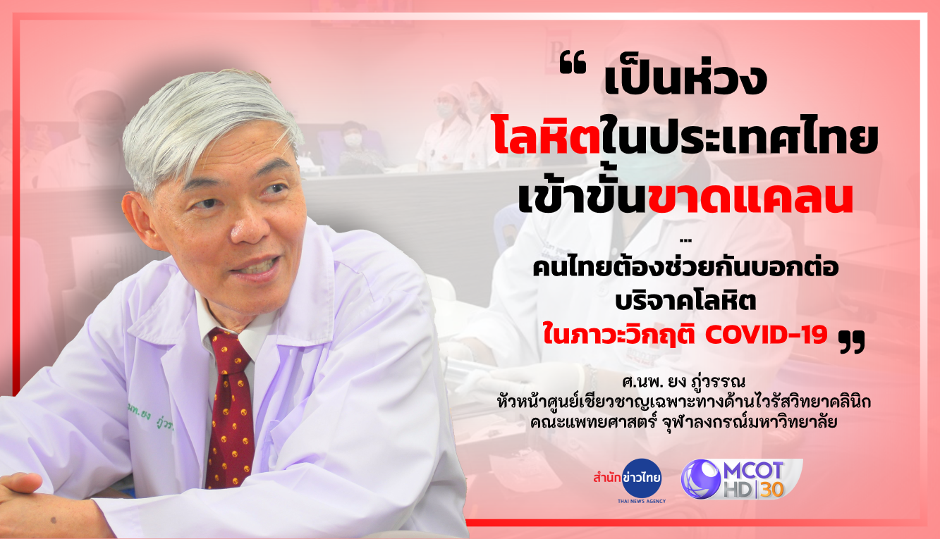 สำนักข่าวไทย : 24 มี.ค. 63 – ศ.นพ.ยง ภู่วรรณ เป็นห่วง โลหิตในประเทศไทยเข้าขั้นขาดแคลน คนไทยต้องช่วยกันบอกต่อ ในภาวะวิกฤติ covid-19