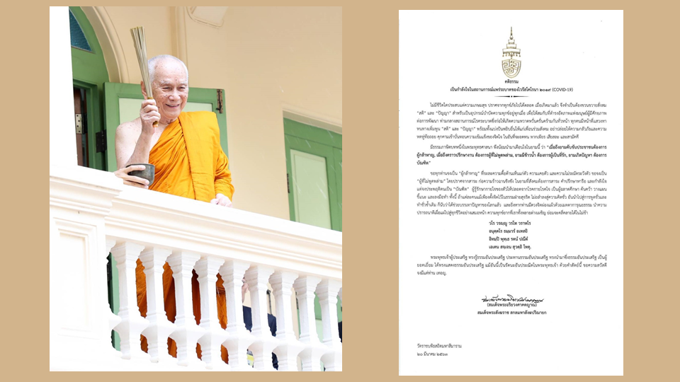 สำนักข่าวไทย 24 มี.ค.-สมเด็จพระอริยวงศาคตญาณ สมเด็จพระสังฆราช สกลมหาสังฆปริณายก ประทานพระคติธรรม เป็นกำลังใจในสถานการณ์แพร่ระบาดของไวรัสโคโรนา2019 (COVID-19)