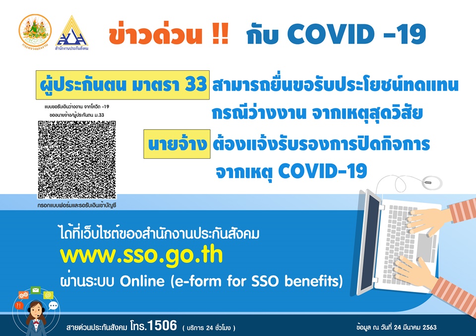 สำนักงานประกันสังคมได้เพิ่มช่องทางการให้บริการเป็นกรณีพิเศษให้กับผู้ประกันตนในการยื่นขอรับประโยชน์ทดแทนกรณีว่างงานจากเหตุสุดวิสัย สามารถยื่นแบบได้ทางระบบอิเล็กส์ทรอนิคหน้าเวปไซต์สำนักงานประกันสังคม www.sso.go.th หัวข้อขอรับประโยชน์ทดแทนกรณีว่างงาน online (e-form for sso benefits)
