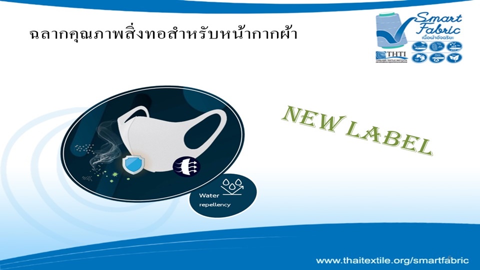 นายชาญชัย สิริเกษมเลิศ ผู้อำนวยการสถาบันพัฒนาอุตสาหกรรมสิ่งทอ เปิดเผยว่า คณะกรรมการบริหารเครื่องหมายคุณภาพสิ่งทอไทยมีมติเห็นชอบหลักเกณฑ์และอนุมัติให้ใช้เครื่องหมาย Smart Fabric หน้ากากผ้าเมื่อวันที่ 20 มีนาคม 2563 โดยหน้ากากผ้าที่จะได้รับเครื่องหมายนี้ต้องผ่านการทดสอบและมีประสิทธิภาพสามารถใช้งานซ้ำและผ่านการซักล้างอย่างน้อย 10 ครั้งขึ้นไป มาตรการที่กำหนดสามารถกรองฝุ่นละอองขนาดเล็ก 0.5 ไมครอน ไม่น้อยกว่า 65% โดยคุณสมบัติดังกล่าวยังสามารถกัน PM 2.5 ได้ (หัวข้อทดสอบ Sub-micron particulate filtration efficiency at 0.5 micron โดยข้อกำหนดด้านประสิทธิภาพ คือ >65%) การซึมผ่านได้ของอากาศ (1 – 50 ซีซี ต่อพื้นที่ตารางเซนติเมตรต่อวินาที) หากอากาศยิ่งผ่านได้มากประสิทธิภาพการป้องกันฝุ่นละอองไอจามก็จะยิ่งน้อย (หัวข้อทดสอบการผ่านได้ของอากาศ โดยข้อกำหนดด้านประสิทธิภาพ คือ 1 < X <50)