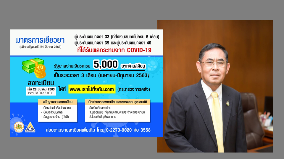 สำนักงานประกันสังคม ขอให้ผู้ประกันตนมาตรา 39 และ 40 ลงทะเบียนเข้าร่วมมาตรการเยียวยาจากผลกระทบดังกล่าว จากกระทรวงการคลัง เริ่มลงทะเบียนวันแรก ในวันที่ 28 มีนาคม 2563 นี้ เป็นต้นไป ตั้งแต่เวลา 08.00–18.00 น.โดยนำหลักฐานคือ ถ่ายบัตรประจำตัวประชาชน ข้อมูลส่วนบุคคลข้อมูลนายจ้าง (ถ้ามี) ลงทะเบียนผ่าน www.เราไม่ทิ้งกัน.COM เมื่อผ่านการลงทะเบียนตรวจสอบคุณสมบัติแล้วก็จะได้รับเงินเยียวยา และการโอนเงินผ่านระบบอิเล็กทรอนิกส์ เช่น พร้อมเพย์ ที่ผูกกับเลขบัตรประจำตัวประชาชน