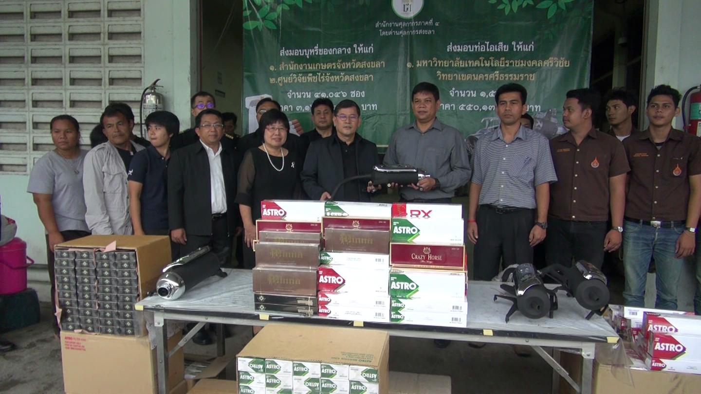 สงขลา 1 ธ.ค.- ศก.ภาค 4 มอบของกลางบุหรี่นับหมื่นซองคดีสิ้นสุดแล้วให้ 2 หน่วยงาน ใช้เป็นประโยชน์ต่อการเกษตรทำยาปราบศัตรูพืช ส่วนท่อไอเสียใช้พัฒนางานวิจัยของคณะวิทย์ มทร.ศรีวิชัย