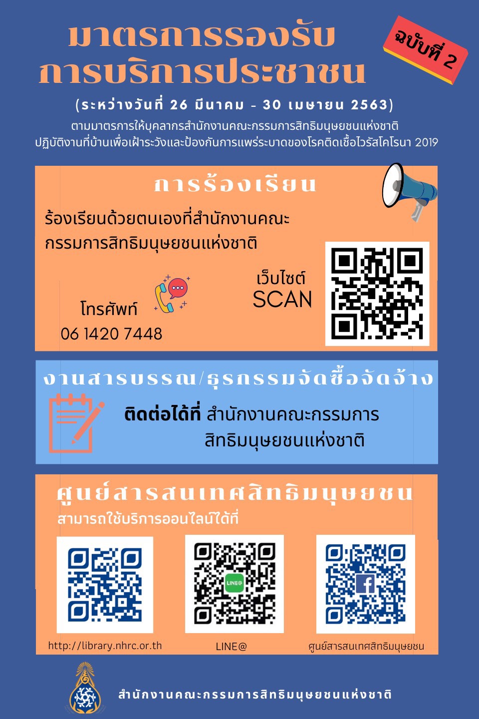 วันนี้ (26 มี.ค) สำนักงานคณะกรรมการสิทธิมนุษยชนแห่งชาติ ออกประกาศ เรื่อง มาตรการรองรับการบริการประชาชนในระหว่างการเฝ้าระวังและป้องกันการแพร่ระบาดของโรคติดเชื้อไวรัสโคโรนา 2019 ฉบับที่ 2 โดยกำหนดให้ข้าราชการ พนักงานราชการ ลูกจ้าง และเจ้าหน้าที่อื่นของสำนักงาน กสม. บางส่วน ปฏิบัติงานที่บ้านพักเพิ่มเติม จากเดิมตั้งแต่วันที่ 20–27 มีนาคม ไปจนถึงวันที่ 30 เมษายน ตามเงื่อนไขที่ผู้อำนวยการสำนักหรือผู้อำนวยการหน่วยกำหนด เพื่อไม่ให้เกิดความเสียหายแก่ราชการและไม่กระทบต่อการให้บริการแก่ประชาชน