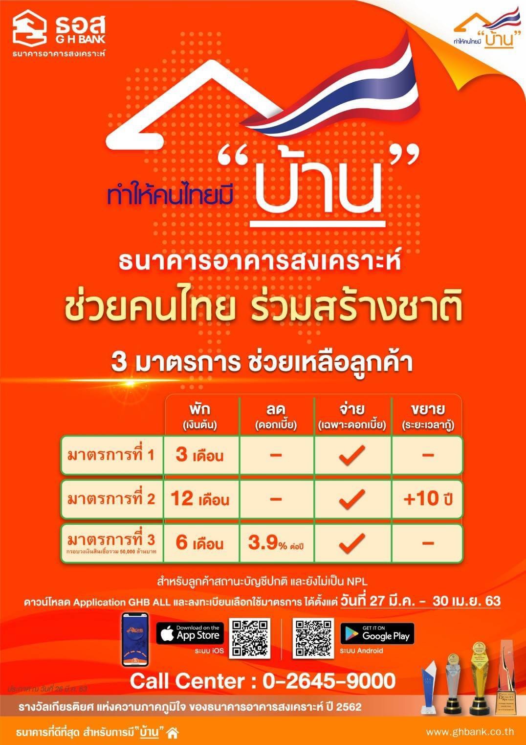 ธนาคารอาคารสงเคราะห์ สนับสนุนนโยบายรัฐบาล ตามแนวคิด ดร.อุตตม สาวนายน รัฐมนตรีว่าการกระทรวงการคลัง และนโยบายธนาคารแห่งประเทศไทย (ธปท.) จัดทำ “โครงการ ธอส. ช่วยคนไทย ร่วมสร้างชาติ” แบ่งเบาภาระค่าใช้จ่ายให้แก่ลูกค้าของ ธอส. ที่ได้รับผลกระทบจากการแพร่ระบาดของไวรัส COVID-19 ครอบคลุมทุกวัตถุประสงค์การกู้ ให้สามารถลดค่าใช้จ่ายในการผ่อนชำระเงินกู้เพื่อที่อยู่อาศัย โดยแบ่งออกเป็น 3 มาตรการ ประกอบด้วย มาตรการที่ 1 พักชำระเงินต้นระยะเวลา 3 เดือน และจ่ายเฉพาะดอกเบี้ยรายเดือน สำหรับลูกค้าที่มีวงเงินกู้ไม่เกิน 3 ล้านบาท มาตรการที่ 2 พักชำระเงินต้นระยะเวลา 1 ปี และจ่ายเฉพาะดอกเบี้ยรายเดือน เมื่อครบกำหนดระยะเวลาพักชำระเงินต้น สามารถแจ้งความประสงค์ขยายระยะเวลา การผ่อนชำระเพิ่มได้นานสูงสุดอีก 10 ปี และมาตรการที่ 3 พักชำระเงินต้นระยะเวลา 6 เดือน พร้อมลดดอกเบี้ยเหลือ 3.90% ต่อปี และจ่ายเฉพาะดอกเบี้ยรายเดือน (กรอบวงเงินสินเชื่อ 50,000 ล้านบาท) เริ่มลงทะเบียนแจ้งความประสงค์เข้าร่วมโครงการผ่าน Mobile Application : GHB ALL ได้ตั้งแต่วันที่ 27 มีนาคม 2563