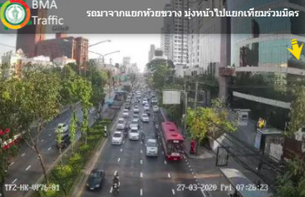 กทม. 27 มี.ค.-สวพ.FM91 รายงานจราจรเช้าวันศุกร์ ถนนรัชดาภิเษก ขาเข้า จากห้วยขวาง มุ่งหน้าแยกเทียมร่วมมิตร รถมาก ท้ายแถวสะสมอุโมงค์สุทธิสาร