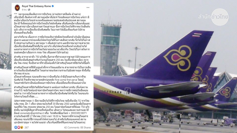 สถานเอกอัครราชทูต ณ กรุงโรม อิตาลี โพสต์ข้อความผ่านทางเฟซบุ๊ก เมื่อวันที่ 26 มีนาคม ตามเวลาท้องถิ่น ซึ่งช้ากว่าประเทศไทย 6 ชั่วโมง ระบุข้อความว่า มีความเป็นไปได้ที่การบินไทยจะมีเที่ยวบิน TG จากโรม -กรุงเทพฯ อีก 1 เที่ยว ในวันที่ 30 มีนาคม 2563 แต่จะต้องมีผู้โดยสารจองที่นั่ง โรม-กรุงเทพฯ ประมาณ 250 คน ค่าบัตรโดยสารที่นั่งละ 750 ยูโร ดังนั้น ขอให้ผู้มีสัญชาติไทยที่พร้อมที่จะเดินทาง โปรดแสดงความจำนงมาที่ อีเมล์ consolato@ambthai.it หรือ โทรศัพท์ฮอตไลน์ +393338518071 ภายในวันศุกร์ที่ 27 มีนาคม 2563 เวลา 18.00 น. หากมีจำนวนผู้โดยสารเพียงพอ จะแจ้งวิธีการจองตั๋วให้ทราบต่อไป สำหรับใบรับรองแพทย์ สถานเอกอัครราชทูต ฯ จะให้คำแนะนำเกี่ยวกับคลีนิคที่รับตรวจต่อไปโดยด่วน