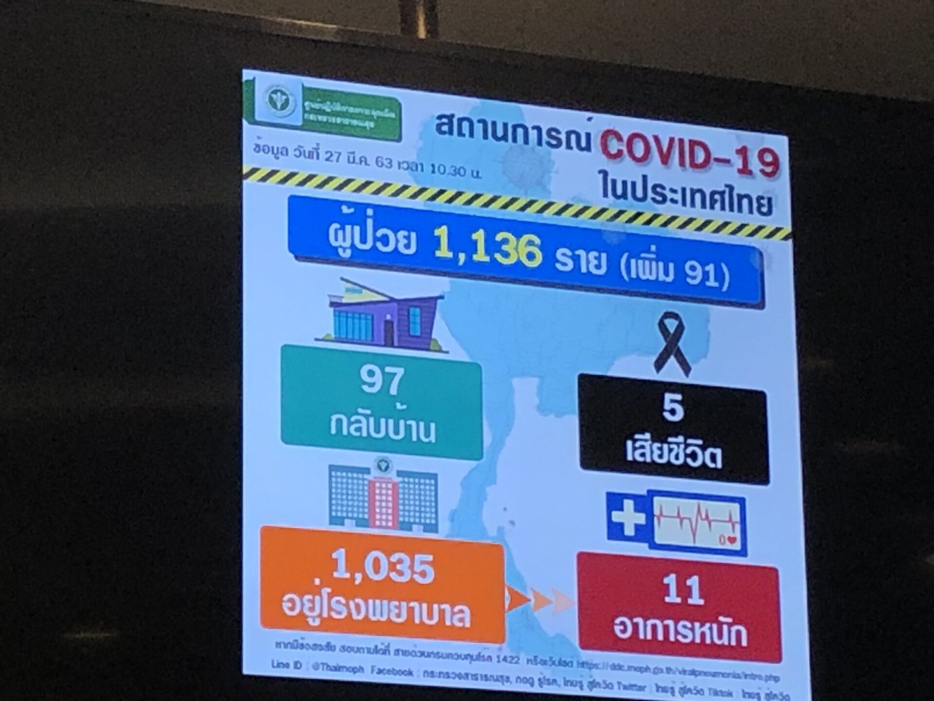 BANGKOK, March 27 (TNA) – Thai Public Health Ministry reports one more Covid-19 death and 91 new patients, raising the total cases in the country to 1,136.
