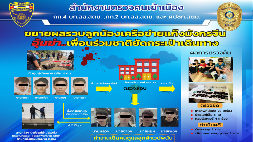 โดยสืบสวนพบว่า MR.FAN ผู้ต้องหาตามหมายจับ ศาลจังหวัด กำแพงเพชร ฐาน “ร่วมกันฆ่าผู้อื่นโดยไตร่ตรองไว้ก่อนฯ” เคยพักอาศัยอยู่ที่ คอนโดย่านเขตห้วยขวาง พร้อมกับบุคคลต่างด้าวสัญชาติจีน จำนวนหลายคนซึ่งปัจจุบัน ยังมีผู้พักอาศัยอยู่ เจ้าหน้าที่จึงได้วางแผนจัดกำลังติดตามเฝ้าระวังบริเวณคอนโดดังกล่าว พบว่ามีชายชาวจีน จำนวน 4 คน คือนายลัว (MR. LUO) อายุ 28 ปี 2. นายหยู (MR.YU) อายุ 27 ปี 3. นายเพิง (MR.PENG) อายุ 21 ปี และ 4. นายจาง (MR.ZHANG) อายุ 24 ปี พักอาศัยอยู่และมีพฤติการณ์ต้องสงสัย จึงได้ร่วมกันเข้าตรวจค้นห้องพักและทรัพย์สินพร้อมเอกสารซึ่งต้องสงสัยว่า มีไว้เป็นความผิดหรือมีไว้ใช้หรือได้ใช้เพื่อกระทำความผิดหรือได้มาจากการกระทำความผิด รวมรายการตรวจยึด จำนวน 40 รายการ ส่วนรายการตรวจยึดอื่นๆ ภายในห้องพัก ผู้ถูกตรวจยึดที่ 1-4 ให้การว่าเป็นทรัพย์สินของ MR.FAN ผู้ต้องหาฯ จึงได้ตรวจยึดไว้เพื่อตรวจสอบต่อไป