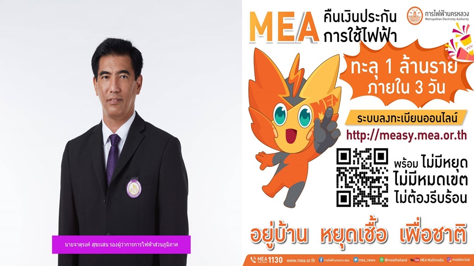 การไฟฟ้านครหลวง หรือ MEA แจ้งว่าตั้งแต่วันที่ 25 มีนาคม 2563 ที่เปิดให้มีการลงทะเบียนตรวจสอบสิทธิ์ขอคืนเงินประกันการใช้ไฟฟ้าจนถึงวันที่ 27 มีนาคม 2563 เช้านี้มีผู้ลงทะเบียนกว่า 1 ล้านราย เป็นปริมาณเดียวกับการไฟฟ้าส่วนภูมิภาค หรือ PEA โดยลูกค้า MEA ที่จะได้สิทธิ์การคืนเงินมีประมาณ 3.85 ล้านราย เป็นเงินประมาณ 13,500 ล้านบาท ส่วนลูกค้า PEA มี 18.3.ล้านราย วงเงิน 19,699 ล้านบาท ลงทะเบียนออนไลน์ได้ตลอด ไม่มีการกำหนดวันปิดลงทะเบียนแต่อย่างใด และจะได้รับเงินคืนวันแรก 31มีนาคมนี้ โดยขอความร่วมมือให้ผู้ใช้ไฟฟ้าลงทะเบียนตรวจสอบสิทธิ์คืนเงินประกันการใช้ไฟผ่านช่องทางออนไลน์ งดเดินทางมาที่สำนักงานการไฟฟ้า เพื่อลดการแพร่ระบาดและป้องกันการแพร่เชื้อ COVID-19 ตามมาตรการของรัฐบาล “อยู่บ้าน ลดเชื้อ เพื่อชาติ”