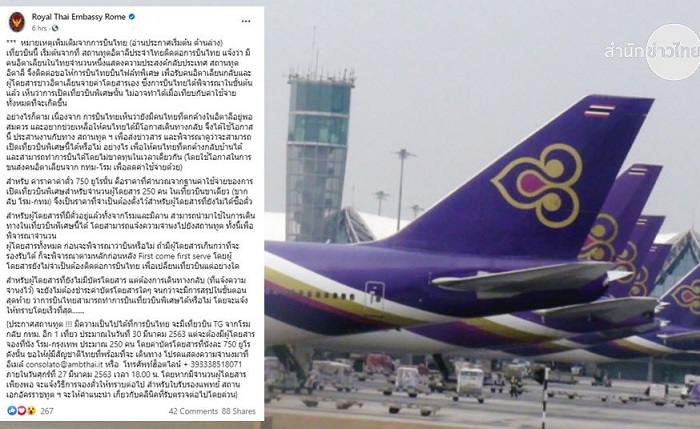 The Thai embassy in Rome stated that the national airline might operate the flight if there are at least about 250 passengers. Thai people in Italy would have to reserve tickets within 6pm on March 27. The fare is set at 750 euros.