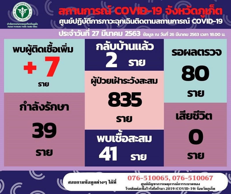 ด้านคณะกรรมการโรคติดต่อจังหวัดภูเก็ต รายงานสถานการณ์โควิด-19 วันที่ 5 ม.ค. – 26 มี.ค.2563 มีผู้ป่วยยืนยันติดเชื้อ 41 ราย (รวมรายล่าสุด 7 รายแล้ว) ในจำนวนนี้รักษาหายและกลับได้ 2 ราย ทั้งหมดอาการอยู่ในเกณฑ์ไม่รุนแรง ส่วน 80 ราย รอผลตรวจยืนยันทางห้องปฏิบัติการ สำหรับผู้ป่วยโควิด-19 ที่พบในจังหวัดภูเก็ตส่วนใหญ่เป็นกลุ่มผู้ที่มีความเกี่ยวพันกับสถานบันเทิงในพื้นที่ ซ.บางลา ต.ป่าตอง อ.กะทู้ จ.ภูเก็ต ซึ่งทีมงานสาธารณสุขจังหวัดภูเก็ตและผู้เกี่ยวข้องได้ดำเนินการสอบสวนผู้ป่วยทุกราย เพื่อควบคุมและป้องกันโรคตามแนวทางของกระทรวงสาธารณสุข.-สำนักข่าวไทย