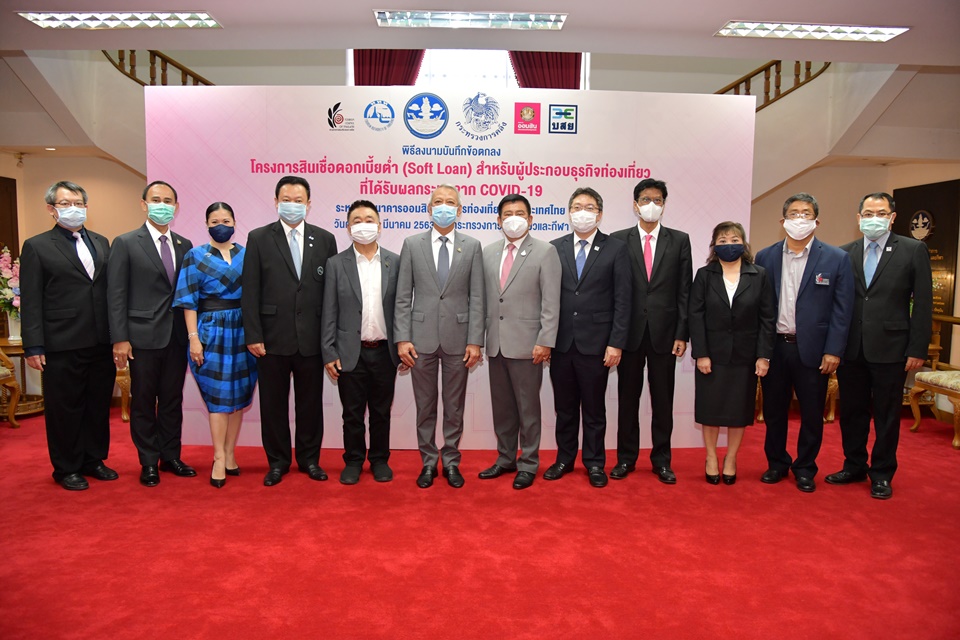 วันนี้ (27 มี.ค.) ที่กระทรวงการท่องเที่ยวและกีฬา มีพิธีลงนามในบันทึกข้อตกลง “โครงการสินเชื่อดอกเบี้ยต่ำ (Soft Loan) สำหรับผู้ประกอบธุรกิจท่องเที่ยวที่ได้รับผลกระทบจาก COVID-19” เพื่อช่วยเหลือผู้ประกอบการธุรกิจท่องเที่ยวที่ได้รับผลกระทบจากการแพร่ระบาดของเชื้อไวรัสโคโรนา COVID-19 มีธนาคารออมสิน ร่วมกับการท่องเที่ยวแห่งประเทศไทย (ททท.) สภาอุตสาหกรรมท่องเที่ยวแห่งประเทศไทย และบรรษัทประกันสินเชื่ออุตสาหกรรมขนาดย่อม (บสย.) ในการดำเนินการตามมาตรการเร่งด่วนของรัฐบาล ซึ่งจะอำนวยความสะดวกในการเข้าถึงแหล่งทุนสำหรับการเสริมสภาพคล่อง เป็นประโยชน์ต่อผู้ประกอบการอุตสาหกรรมท่องเที่ยวของไทยได้เข้าถึงสินเชื่อดอกเบี้ยต่ำต่อไป โดยมี นายพิพัฒน์ รัชกิจประการ รัฐมนตรีว่าการกระทรวงการท่องเที่ยวและกีฬา เป็นประธานในพิธีลงนาม
