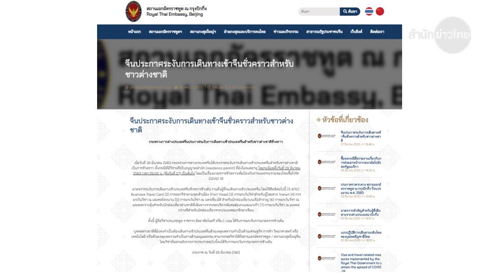 สถานเอกอัครราชทูต ณ กรุงปักกิ่ง โพสต์ข้อความผ่านทางเว็บไซต์ https://thaiembbeij.org แจ้งว่า เมื่อวันที่ 26 มีนาคม 2563 กระทรวงการต่างประเทศจีนประกาศระงับการเดินทางเข้าประเทศจีนสำหรับชาวต่างชาติชั่วคราว ทั้งกรณีที่มีวีซ่า หรือ ใบอนุญาตพำนัก (residence permit) ที่ยังไม่หมดอายุ โดยจะมีผลตั้งวันที่ 28 มีนาคม 2563 เวลา 00.00 น. เป็นต้นไป โดยเป็นเรื่องมาตรการชั่วคราวเพื่อป้องกันการแพร่กระจายของโรคเชื้อไวรัส COVID-19