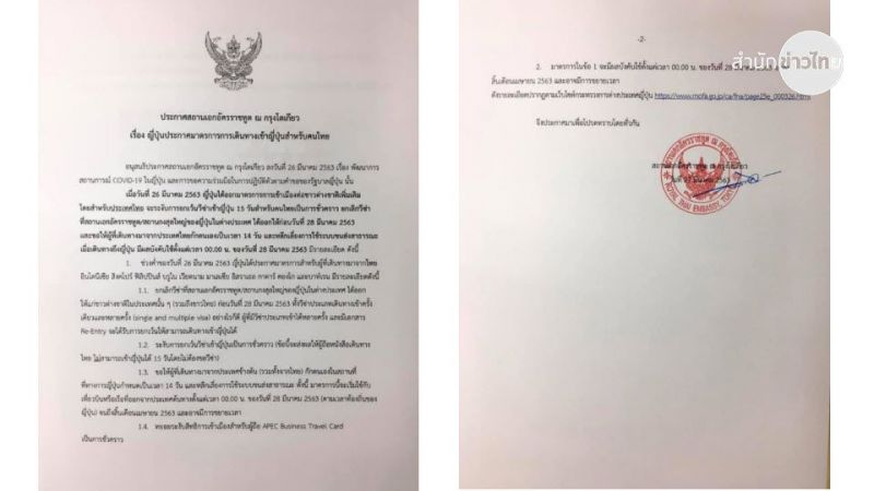 Thai embassy in Tokyo posted a message on its Facebook page that travel restriction for Thais will be imposed until the end of April and could be extended.