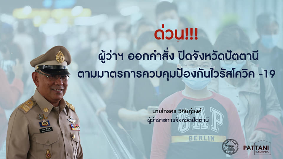 ปัตตานี 28 มี.ค. – ผู้ว่าฯ ปัตตานี ประกาศให้ จ.ปัตตานี เป็นพื้นที่เสี่ยงต่อการติดต่อเชื้อโรคโควิด-19 ทั้งพื้นที่ ห้ามประชาชนเดินทางเข้า-ออก ข้ามเขตพื้นที่ จ.ปัตตานี เว้นแต่เพื่อประโยชน์ในการรักษาพยาบาล การขนส่งสินค้าที่จำเป็น สินค้าอุปโภค-บริโภค เป็นต้น หากผู้ใดฝ่าฝืนมีโทษทั้งจำทั้งปรับ