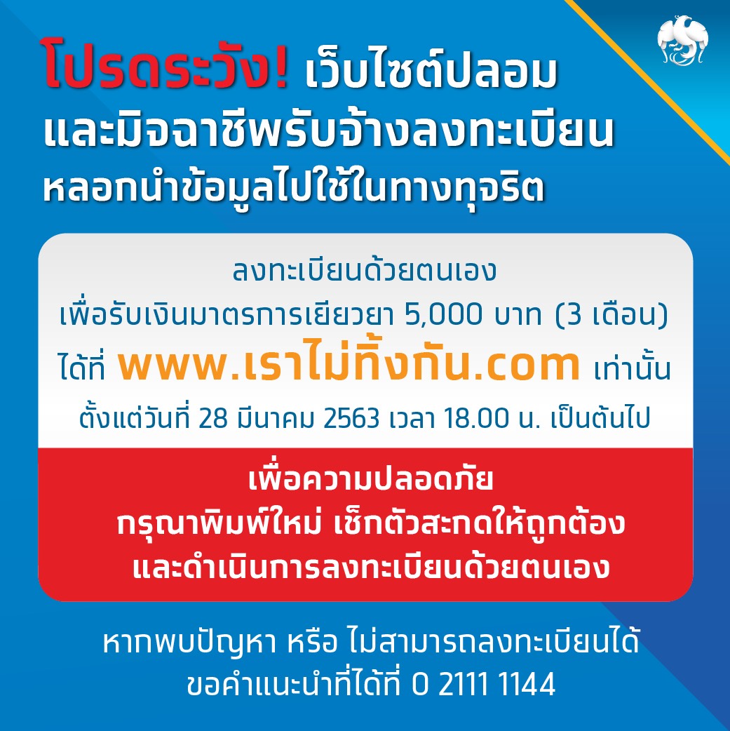 ขอให้พึงระวังและอย่าหลงเชื่อโดยง่าย และขอเน้นย้ำว่า มาตรการเยียวยา 5,000 บาท (3 เดือน) เปิดรับลงทะเบียนผ่านทาง www.เราไม่ทิ้งกัน.com เริ่มตั้งแต่วันเสาร์ที่ 28 มีนาคม 2563 เวลา 18.00 น. เป็นต้นไป