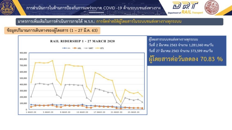 ขณะที่การเดินทางโดยระบบขนส่งรถไฟฟ้า ปัจจุบันมีให้บริการ 4 ระบบ คือ รถไฟฟ้า บีทีเอส , MRT รถไฟฟ้า airport rail link และรถไฟ รฟท. ซึ่งล่าสุดนายสรพงศ์ ไพฑูรย์พงษ์ อธิบดีกรมการขนส่งทางราง (ขร.) ระบุ ผู้โดยสารที่เดินทางระบบรางลดลงถึง 71% แล้ว โดยเปรียบเทียบระหว่างช่วงต้นเดือนกับวันศุกร์ที่ 27 มีนาคม 2563