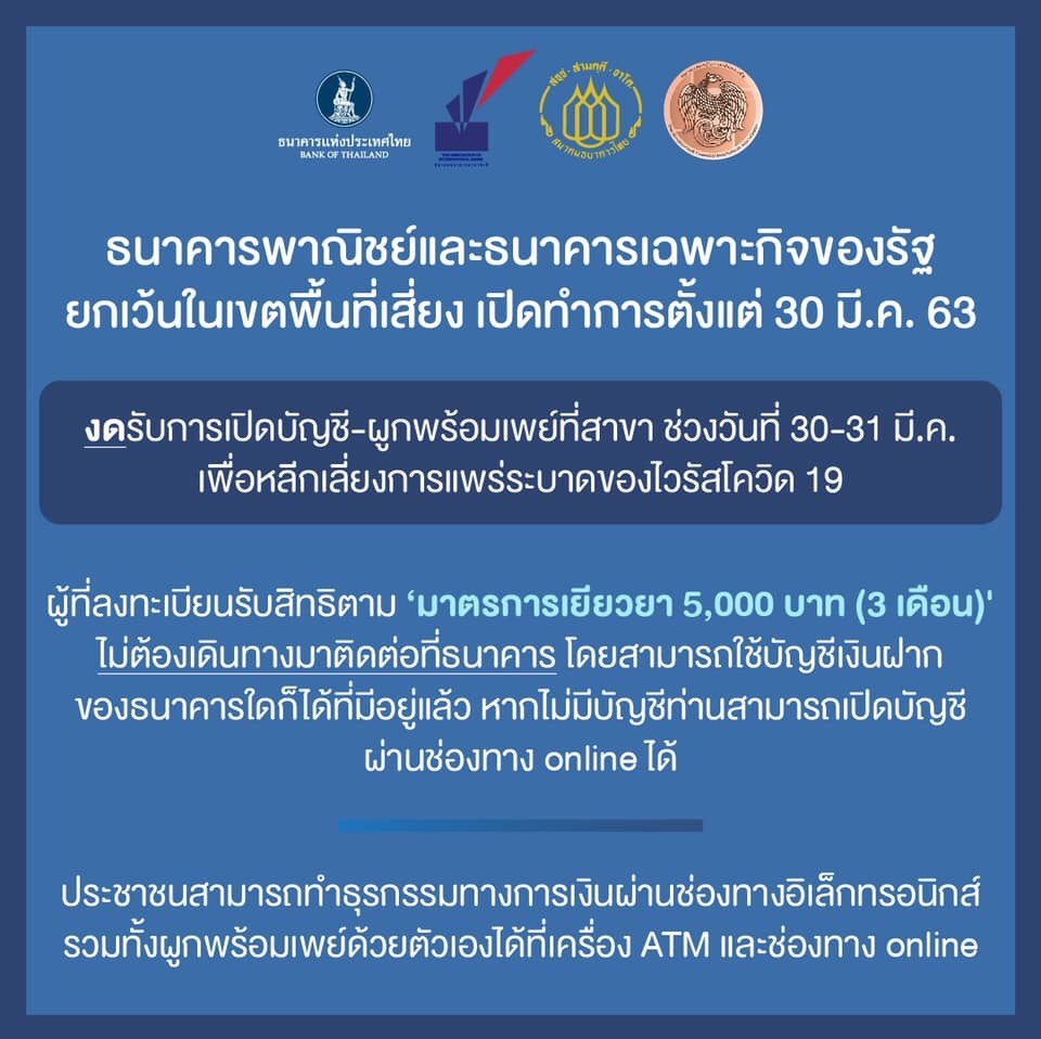 ธนาคารแห่งประเทศไทย (ธปท.) สมาคมธนาคารไทย สมาคมธนาคารนานาชาติ และสมาคมสถาบันการเงินของรัฐ ขอแจ้งว่าตั้งแต่วันพรุ่งนี้ (30 มี.ค.) ธนาคารพาณิชย์และธนาคารเฉพาะกิจของรัฐ รวมถึงธนาคารออมสินที่ได้ประกาศปิดทำการไปก่อนหน้านี้ พร้อมเปิดให้บริการตามปกติ แต่งดให้บริการเปิดบัญชีใหม่ และบริการผูกพร้อมเพย์ที่สาขา ระหว่างวันที่ 30-31 มีนาคม 2563 แต่สามารถดำเนินการผ่านช่องทางอิเล็กทรอนิกส์และออนไลน์ เพื่อให้สอดคล้องกับมาตรการของศูนย์อำนวยการแก้ไขสถานการณ์ฉุกเฉิน (ศอฉ.) ที่ขอความร่วมมือให้ยกเว้นกิจกรรมที่จะก่อให้เกิดการเดินทางหรือเคลื่อนย้ายประชาชนจำนวนมากมารวมตัวกัน เพื่อไม่ให้การแพร่ระบาดขยายไปในวงกว้างและเป็นการรับผิดชอบต่อสังคมโดยรวม