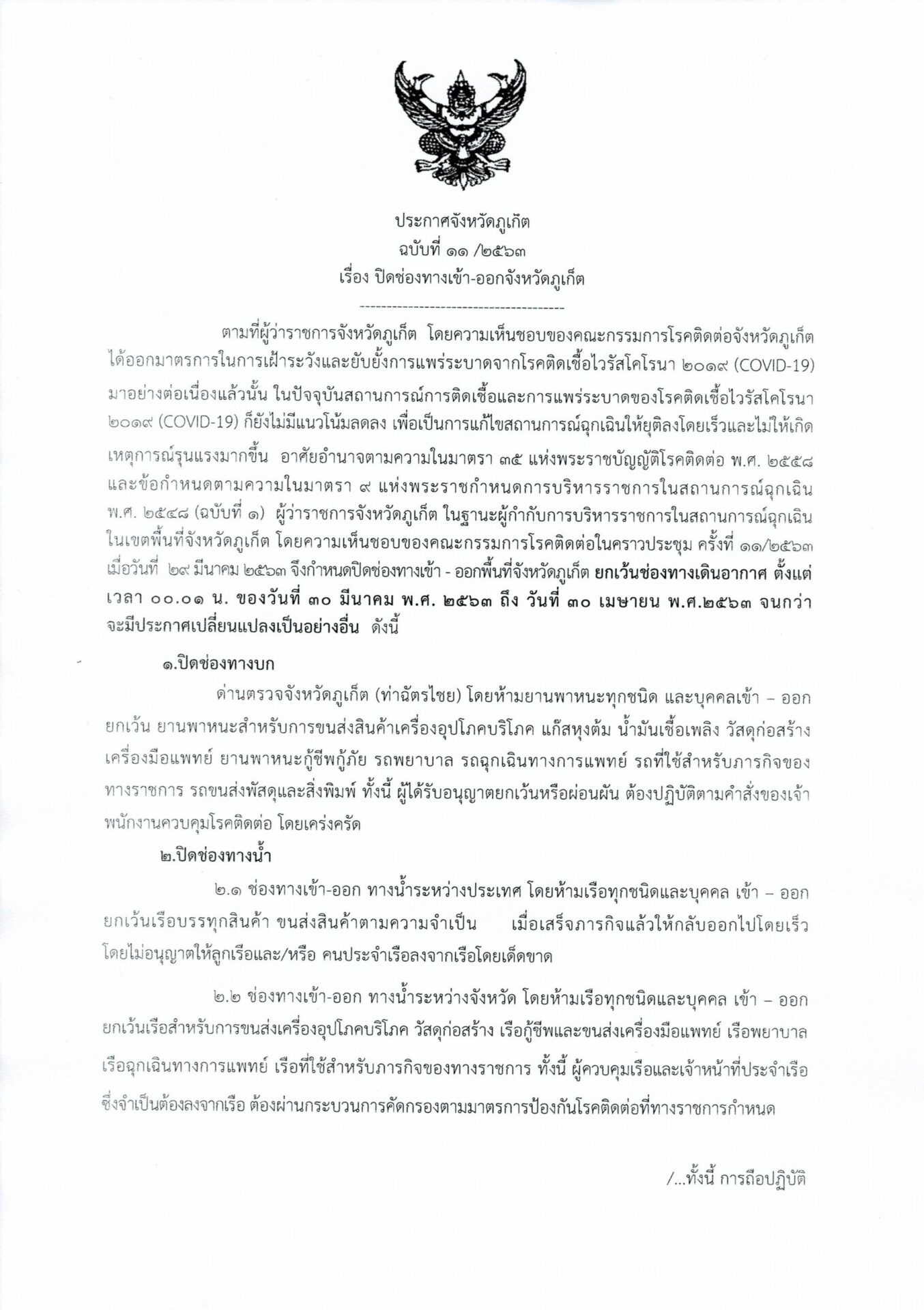 นายภัคพงศ์ ทวิพัฒน์ ผู้ว่าราชการจังหวัดภูเก็ต เซ็นต์คำสั่งลงนามหลัง หลังคณะกรรมการโรคติดต่อจังหวัดภูเก็ตมีมติเห็นชอบออกมาตรการในการเฝ้าระวังและยับยั้งการแพร่ระบาดจากโรคติดเชื้อไวรัสโคโรนา 2019 (COVID-19) การติดเชื้อและการแพร่ระบาดของโรคติดเชื้อไวรัสโคโรนา 2019 (COVID-19) อาศัยอำนาจตามความในมาตรา 35 แห่งพระราชบัญญัติโรคติดต่อ พ.ศ. 2558 และข้อกำหนดตามความในมาตรา 9 แห่งพระราชกำหนดการบริหารราชการในสถานการณ์ฉุกเฉิน พ.ศ. 2548 (ฉบับที่ 1) ผู้ว่าราชการจังหวัดภูเก็ต ในฐานะผู้กำกับการบริหารราชการในสถานการณ์ฉุกเฉิน ในเขตพื้นที่จังหวัดภูเก็ต โดยความเห็นชอบของคณะกรรมการโรคติดต่อในคราวประชุม ครั้งที่ 11/2563 เมื่อวันที่ 29 มีนาคม 2563 จึงกำหนดปิดช่องทางเข้า – ออกพื้นที่จังหวัดภูเก็ต ยกเว้นช่องทางเดินอากาศ ตั้งแต่เวลา 00.01 น. ของวันที่ 30 มีนาคม พ.ศ. 2563 ถึง วันที่ 30 เมษายน พ.ศ.2563 จนกว่าจะมีประกาศเปลี่ยนแปลงเป็นอย่างอื่น ดังนี้