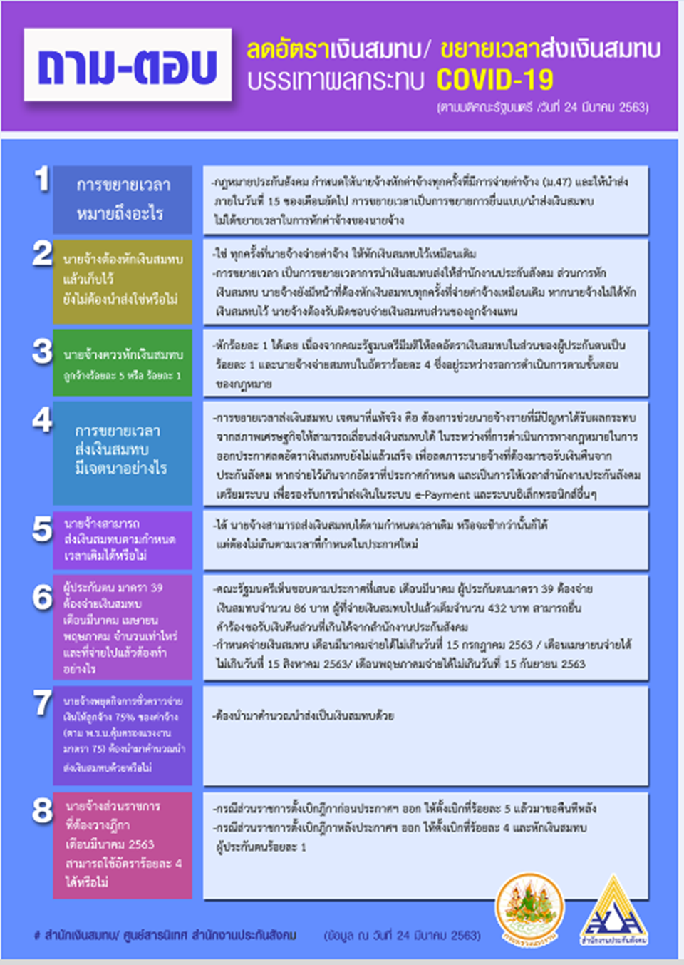 ตามมติคณะรัฐมนตรี เมื่อวันที่ 24 มีนาคม 2563 มาตรการเร่งด่วนในการป้องกันวิกฤตการแพร่ระบาดของโรคติดเชื้อไวรัสโคโรนา 2019 (COVID-19) ครม. มีมติช่วยเหลือนายจ้าง ลูกจ้าง ผู้ประกันตน ในเรื่องของการลดอัตราเงินสมทบและขยายเวลาส่งเงินสมทบ ซึ่งสำนักงานประกันสังคม (สปส.) พบว่าในการนำส่งเงินสมทบดังกล่าวนั้น สถานประกอบการและผู้ประกันตนยังมีข้อคำถามมากมาย จึงดำเนินการรวบรวม ข้อคำถามที่ พบบ่อยและทำคำตอบ เพื่อเผยแพร่แก่สถานประกอบการ ผู้ประกันตนมาตรา 33 และมาตรา 39 จะได้คลายข้อสงสัยในการนำส่งเงินสมทบ
