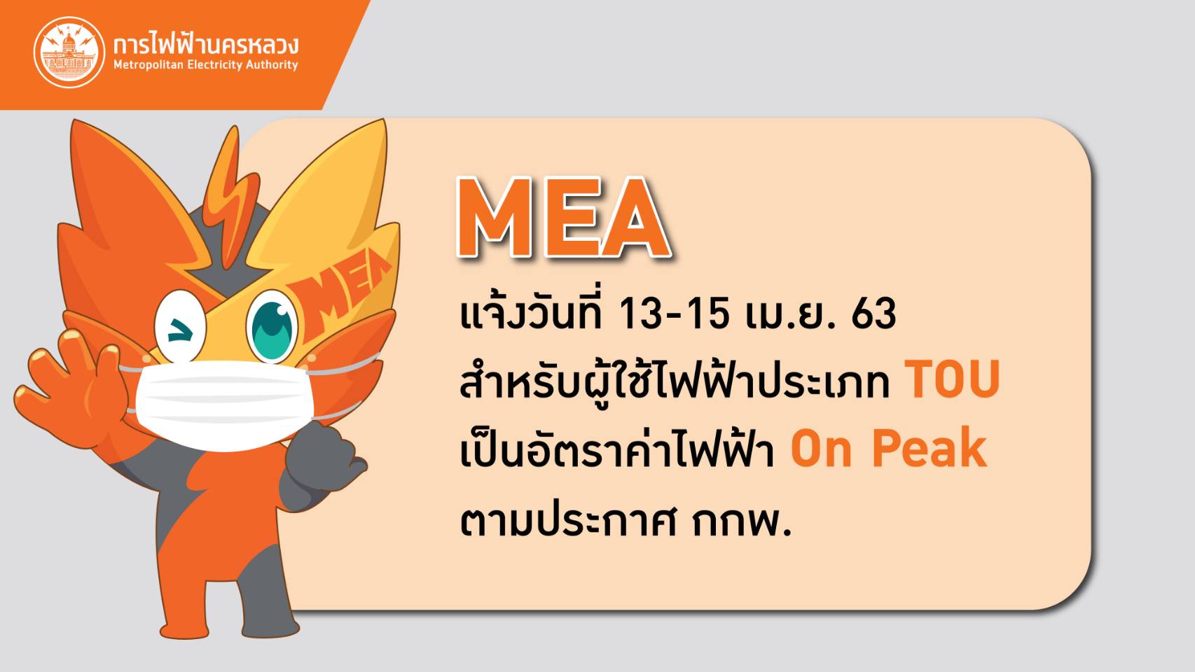 กทม 30 มี.ค.- MEA แจ้งวันที่ 13-15 เม.ย. 63 สำหรับผู้ใช้ไฟฟ้าประเภท TOU เป็นอัตราค่าไฟฟ้า On Peak ตามประกาศ กกพ.