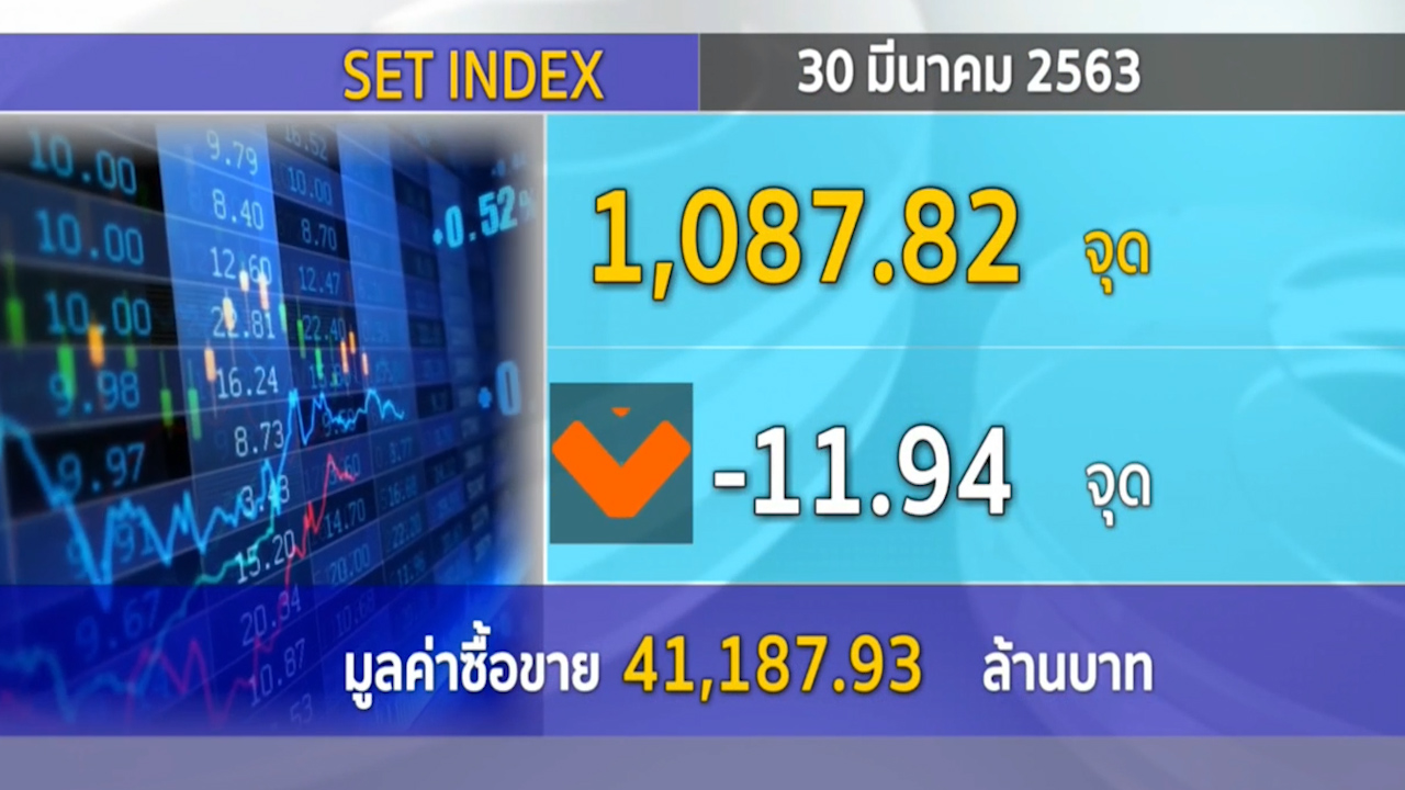 กรุงเทพฯ 30 มี.ค. – ดัชนีตลาดหลักทรัพย์ฯ ปิดวันนี้ (30 มี.ค.) ที่ระดับ 1,087.82 จุด ลดลง 11.94 จุด หรือ 1.09% มูลค่าการซื้อขาย 41,187.93 ล้านบาท โดยดัชนีเคลื่อนไหวแดนลบตลอดทั้งวัน ตามต่างประเทศ หลังยอดผู้ติดเชื้อโควิด-19 เพิ่ม กังวลสภาพคล่องธุรกิจชะงักจากพิษโควิด.-สำนักข่าวไทย