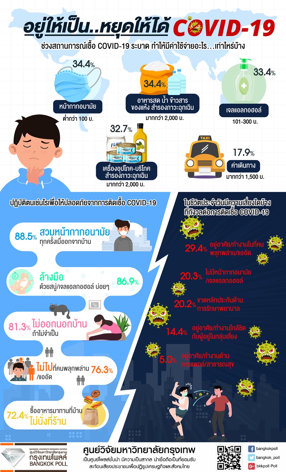 สำนักข่าวไทย 31 มี.ค.-เปิดผลสำรวจ “อยู่ให้เป็น…หยุดให้ได้ : COVID-19” พบประชาชนกว่าร้อยละ 88 ตระหนักเรื่องการสวมหน้ากากอนามัยทุกครั้งเมื่ออกจากบ้าน ช่วยหยุดความเสี่ยงจากการติดเชื้อไวรัสมากที่สุด ขณะที่กว่าร้อยละ30 ระบุในช่วงสถานการณ์ระบาดทำให้ต้องมีค่าใช้จ่ายเพิ่มเพื่อซื้อหน้ากากอนามัย-ค่าอาหาร น้ำ ข้าวสารของแห้ง สำรองภาวะฉุกเฉิน