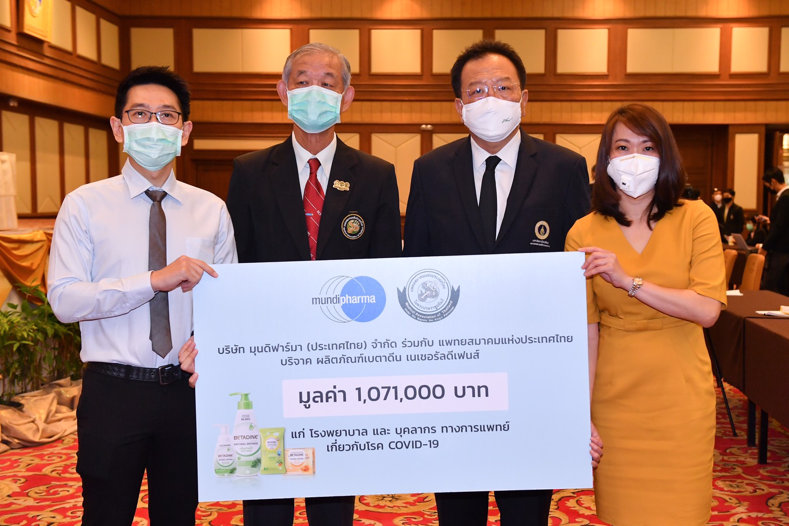 ศ.เกียรติคุณ นพ.อมร ลีลารัศมี นายกแพทยสมาคมแห่งประเทศไทยในพระบรมราชูปถัมภ์ พร้อมด้วย ศ.เกียรติคุณ พญ.สมศรี เผ่าสวัสดิ์ นายกแพทยสภา รับมอบผลิตภัณฑ์ทำความสะอาดเพื่อสุขอนามัย “เบตาดีน เนเชอรัลดีเฟนส์” มูลค่า 1,007,100 บาท จากบริษัท มุนดิฟาร์มา (ประเทศไทย) จำกัด เพื่อกระจายให้แก่โรงพยาบาลและบุคลากรทางการแพทย์ที่ดูแลผู้ป่วยโรคโควิด-19
