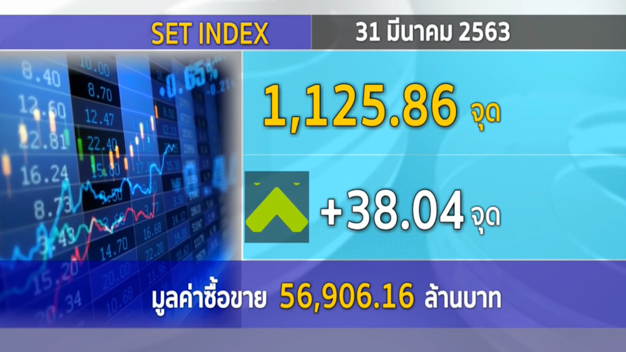 กรุงเทพฯ 31 มี.ค. –ดัชนีตลาดหลักทรัพย์ฯ ปิดวันนี้ (31 มี.ค.) ที่ระดับ 1,125.86 จุด เพิ่มขึ้น 38.04 จุด หรือ 3.50% มูลค่าการซื้อขาย 56,906.16 ล้านบาท โดยดัชนีเคลื่อนไหวแดนบวกตลอดทั้งวัน รีบาวด์ตามต่างประเทศ หลังการระบาดของโควิด-19 ในยูโรโซนเริ่มนิ่ง.-สำนักข่าวไทย