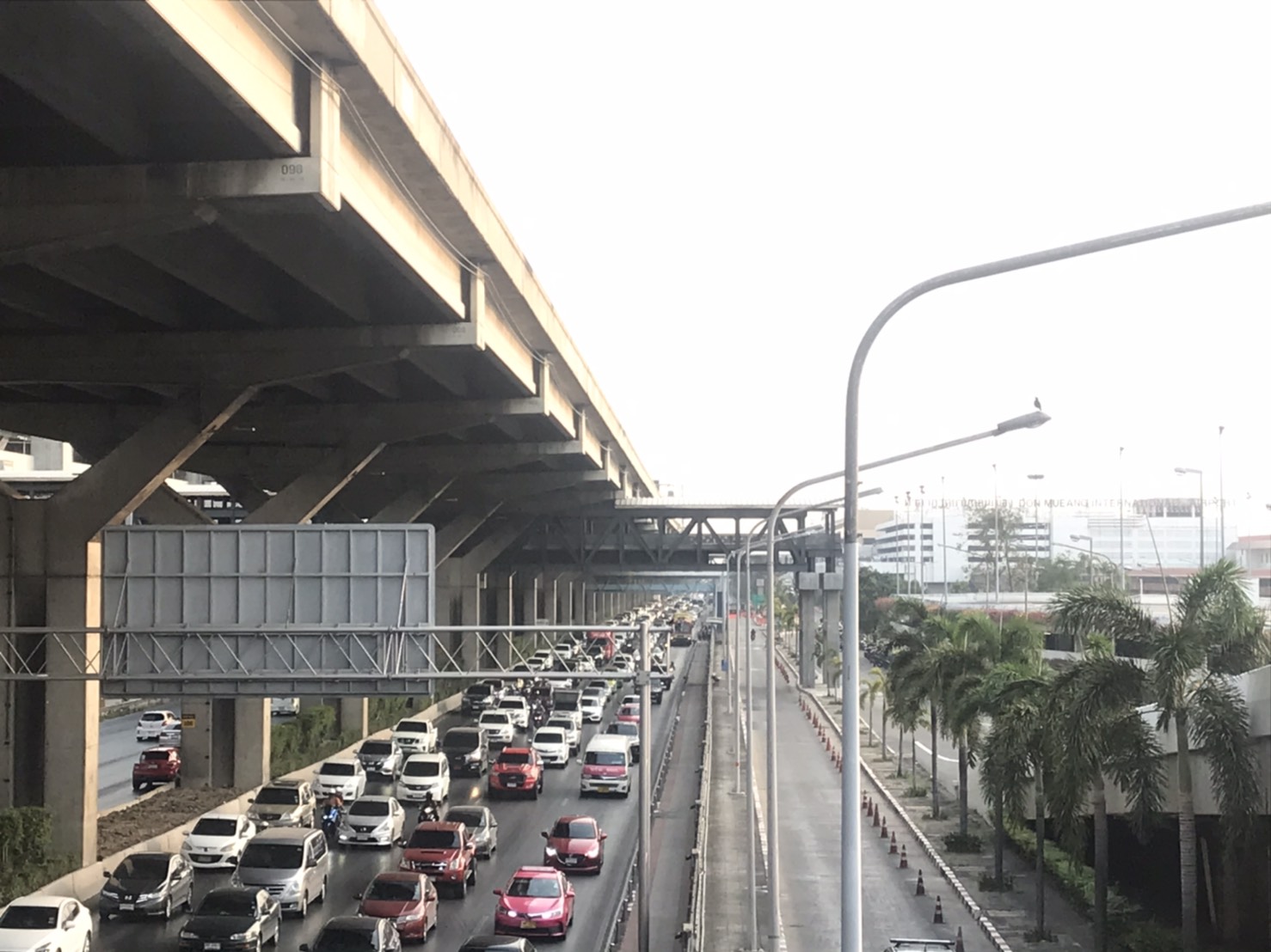 ถนนวิภาวดี-รังสิต ขาเข้า ผ่านหน้าสนามบินดอนเมือง การจราจรติดขัดมาก ท้ายแถวสะสมตรงข้ามเวทีมวยรังสิต ติดขัดช่วงร่วมคลังสินค้า จุดคัดกรอง COVID-19