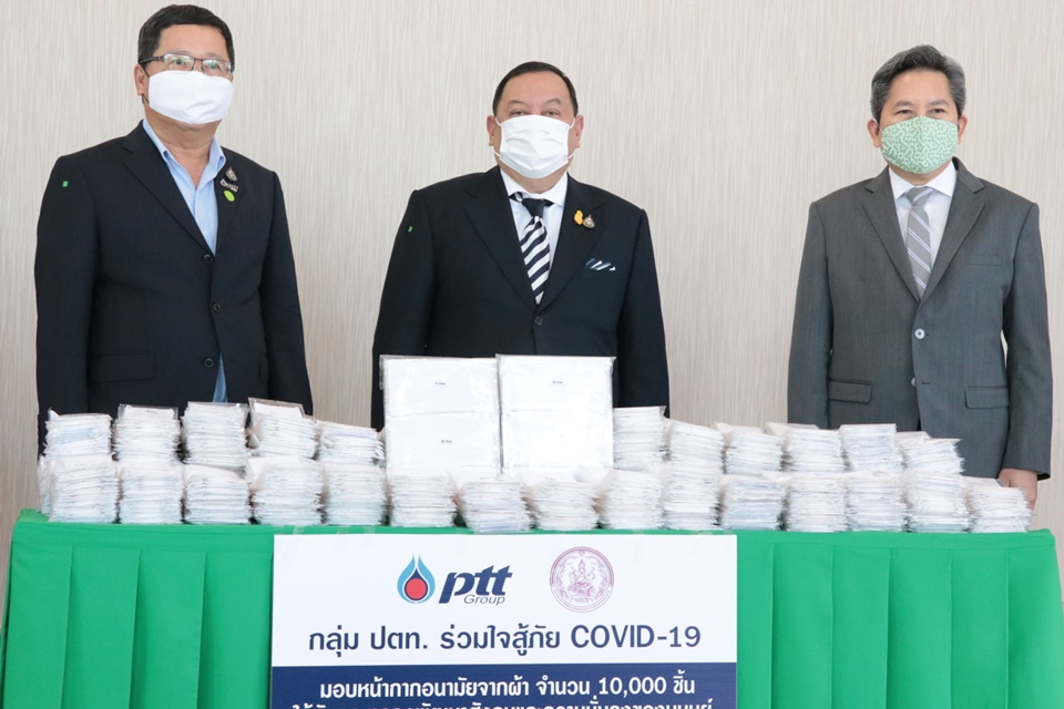 วันนี้(1เม.ย.) ที่กระทรวงการพัฒนาสังคมและความมั่นคงของมนุษย์(พม.) นายจุติ ไกรฤกษ์ รัฐมนตรีว่าการกระทรวงการพัฒนาสังคมและความมั่นคงของมนุษย์ (รมว.พม.)พร้อมด้วย นายปรเมธี วิมลศิริ ปลัด พม.และคณะผู้บริหาร ร่วมรับมอบหน้ากากอนามัยแบบผ้าจำนวน 10,000 ชิ้น จากนายชาญศิลป์ ตรีนุชกร ประธานเจ้าหน้าที่บริหาร และกรรมการผู้จัดการใหญ่ บริษัท ปตท. จำกัด (มหาชน) นอกจากนี้บริษัท บ๊อบ 2005 จำกัด ยังร่วมมอบหน้ากากอนามัยแบบผ้า 57 ชิ้นและเจลแอลกอฮอล์ ขนาด 35 มิลลิลิตรจำนวน 49 ชิ้น