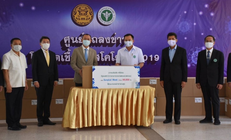 นายอนุทิน ชาญวีรกูล รองนายกรัฐมนตรีและรัฐมนตรีว่าการกระทรวงสาธารณสุข พร้อมด้วย นายสาธิต ปิตุเตชะ รัฐมนตรีช่วยว่าการกระทรวงสาธารณสุข และคณะผู้บริหาร รับมอบหน้ากากอนามัยจำนวน 80,000 ชิ้น จาก นายเฉลิมชัย ศรีอ่อน รัฐมนตรีว่าการกระทรวงเกษตรและสหกรณ์