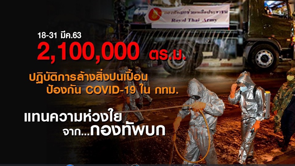 พ.อ.หญิง ศิริจันทร์ งาทอง รองโฆษกกองทัพบก กล่าวว่า ตามที่ พล.อ.อภิรัชต์ คงสมพงษ์ ผู้บัญชาการทหารบก ได้มอบหมายให้หน่วยทหารของกองทัพบก ส่งกำลังพลพร้อมอุปกรณ์และยานพาหนะ เข้าปฏิบัติการล้างสิ่งปนเปื้อนและพ่นยาฆ่าเชื้อป้องกันการแพร่ระบาดของโรคติดเชื้อไวรัสโคโรนา 2019 (โควิด-19) ระหว่างวันที่ 18-31 มีนาคม 2563 ในพื้นที่กรุงเทพมหานคร เน้นพื้นที่เสี่ยง พื้นที่สาธารณะที่ประชาชนไปใช้บริการหนาแน่น โดยตลอด 15 วันที่ผ่านมา สามารถดำเนินการล้างสิ่งปนเปื้อนครอบคลุมพื้นที่ได้ถึง 2,100,000 ตารางเมตร ครบตามแผนงานที่วางไว้ ซึ่งได้สร้างความเชื่อมั่น และประชาชนเห็นถึงความสำคัญของการล้างสิ่งปนเปื้อนดังกล่าว ทั้งนี้ในห้วงเวลาต่อไปกองทัพบกจะยังคง ดำเนินการต่อ โดยเฉพาะในพื้นที่ชุมชนและพื้นที่ที่ได้รับการร้องขอจากภาคส่วนต่าง ๆ รวมถึงการเข้าไปฆ่าเชื้อในหน่วยทหาร