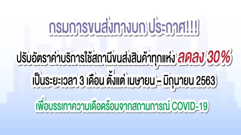 นายจิรุตม์ วิศาลจิตร อธิบดีกรมการขนส่งทางบก เปิดเผยว่า จากสถานการณ์การแพร่ระบาดของโรคติดต่อเชื้อไวรัสโคโรนา 2019 (COVID – 19) ส่งผลกระทบต่อการให้บริการขนส่งสินค้าที่มีความต้องการขนส่งสินค้าในภาพรวมลดลง ทำให้ผู้ประกอบการขนส่งสินค้ามีรายได้จากการให้บริการลดลง กรมการขนส่งทางบกมีนโยบายช่วยเหลือและบรรเทาความเดือดร้อนเบื้องต้นให้กับผู้ประกอบการขนส่งสินค้าในสถานีขนส่งสินค้าทั้ง 3 แห่ง คือ สถานีขนส่งสินค้าพุทธมณฑล สถานีขนส่งสินค้าคลองหลวง และสถานีขนส่งสินค้าร่มเกล้า ด้วยการปรับลดค่าบริการใช้สถานีขนส่งสินค้าทุกแห่ง 30% เป็นระยะเวลา 3 เดือน ตั้งแต่วันที่ 1 เมษายน 2563 ถึงวันที่ 30 มิถุนายน 2563 ประกอบด้วย ค่าเช่าใช้ชานชาลาขนถ่ายสินค้า สำนักงานที่อาคารชานชาลา สำนักงานที่อาคารบริหาร คลังสินค้า ที่พัก ชานชาลาอเนกประสงค์ และพื้นที่จำหน่ายอาหาร