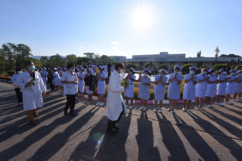 วันนี้ (2 เม.ย.) ที่ลานพระบิดา หน้าอาคารสำนักงานอธิการบดี มหาวิทยาลัยสงขลานครินทร์ วิทยาเขตหาดใหญ่ จ.สงขลา ผศ.ดร.นิวัติ แก้วประดับ อธิการบดีมหาวิทยาลัยสงขลานครินทร์ รศ.นพ.พุฒิศักดิ์ พุทธวิบูลย์ คณบดีคณะแพทยศาสตร์ มหาวิทยาลัยสงขลานครินทร์ และ นพ.เรืองศักดิ์ ลีธนาภรณ์ ผู้อำนวยการโรงพยาบาลสงขลานครินทร์ ร่วมกันมอบดอกุหลาบติดแผ่นกระดาษรูปหัวใจสีชมพู เพื่อเป็นกำลังใจให้กับกลุ่มแพทย์ พยาบาล บุคลากรทางการแพทย์และเจ้าหน้าที่ฝ่ายสนับสนุน จำนวน 40 คน ที่จะเดินทางไปปฏิบัติหน้าที่ที่โรงพยาบาลสงขลานครินทร์ สาขา 2 หรือ บ้านโควิดสงขลา ภายในสวนประวัติศาสตร์พลเอกเปรม ติณสูลานนท์ อำเภอเมือง