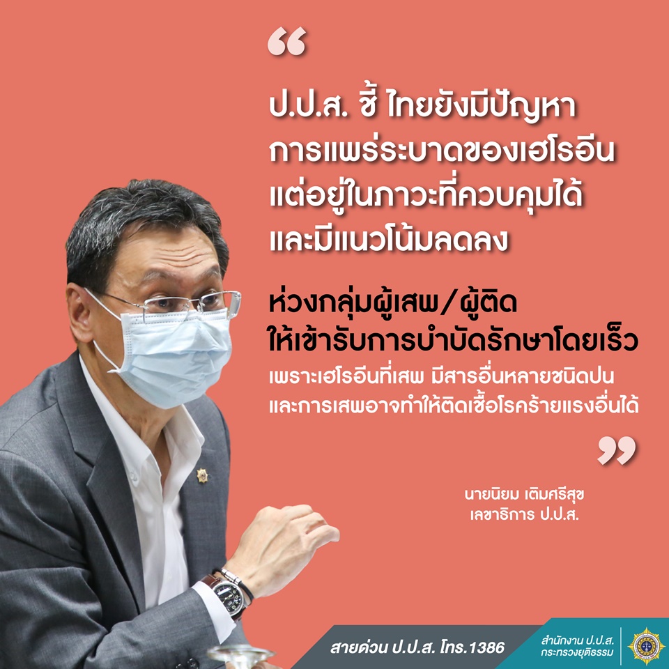 ป.ป.ส.3 เม.ย.-เลขาฯ ป.ป.ส.ชี้ไทยยังมีปัญหาการแพร่ระบาดของเฮโรอีน แต่อยู่ในภาวะควบคุมได้ เผยปี 62 มีผู้ถูกจับในข้อหาเสพ/ครอบครอง ประมาณ 1,000 ราย เข้ารับการบำบัดรักษา 3,700 ราย ห่วงกลุ่มเสพ เพราะเฮโรอีนมีสารอื่นหลายชนิดปนและการเสพอาจทำให้ติดเชื้อโรคร้ายแรงอื่นได้