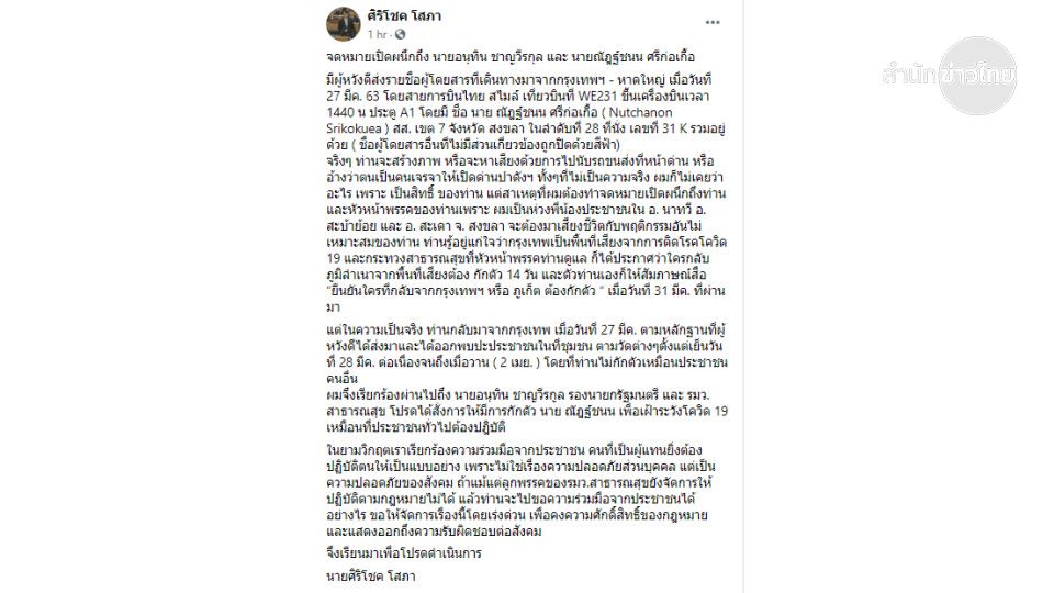 สงขลา 3 เม.ย.- “ศิริโชค” เขียนจดหมายเปิดผนึกโพสต์เฟซบุ๊ก ถึง “อนุทิน” ระบุ ส.ส.สงขลา ภท. แหกกฎ กลับจาก กทม.ไม่กักตัว 14 วัน ถามคนใกล้ตัวยังไม่ฟัง จะขอความร่วมมือจากประชาชนได้อย่างไร
